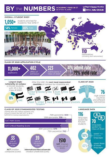If you're as much of a college admissions nerd as I am, our school posted a cool infographic with some statistics about NYUAD, updated with Class of 2020. I'm proud to be part of this.